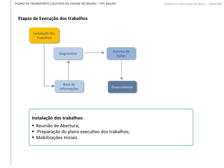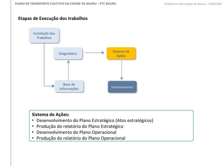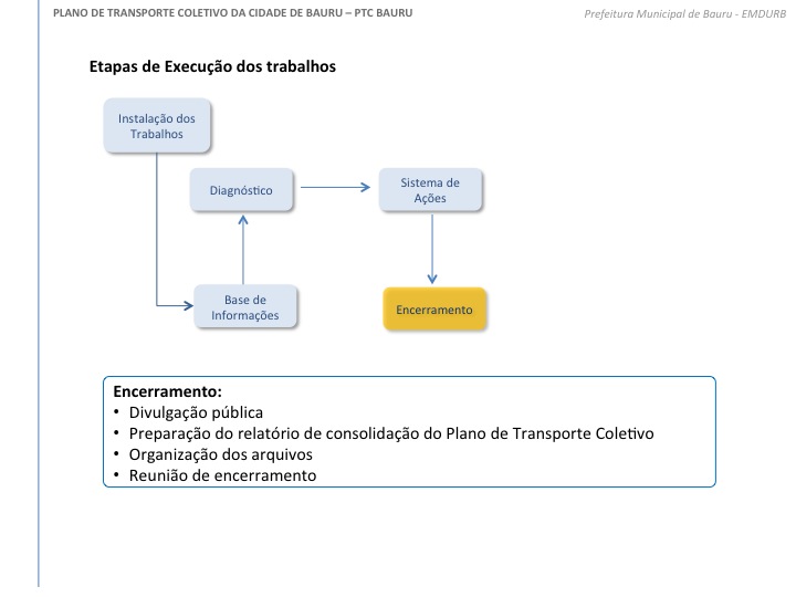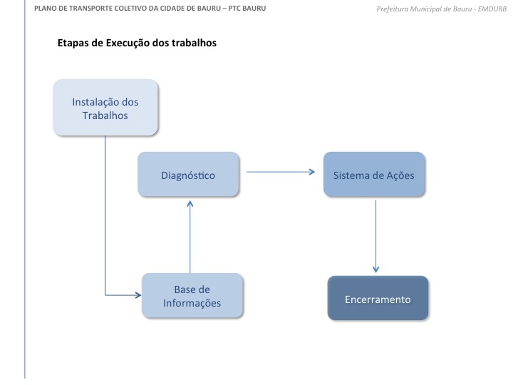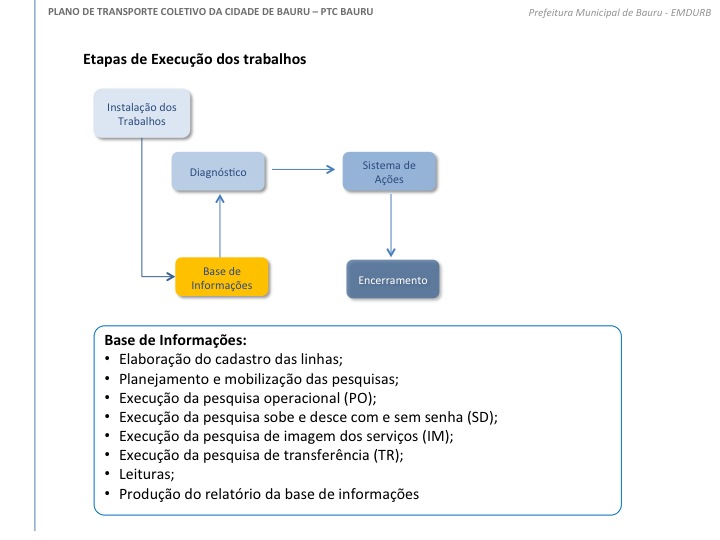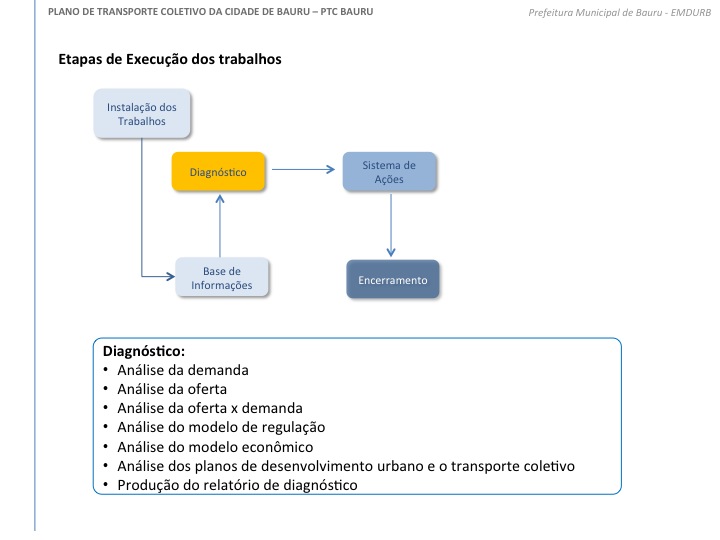 Através da Concorrência Pública n° 001/2012 – Processo n° 4086/12 - a EMDURB contratou uma Empresa especializada para elaborar um Plano de Transporte Coletivo para a cidade de Bauru, que deverá avaliar as atuais condições em que o serviço de transporte coletivo é atualmente prestado.
