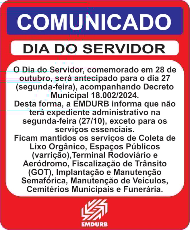 O Dia do Servidor, comemorado em 28 de outubro, será antecipado para o dia 27 (segunda-feira), acompanhando Decreto Municipal 18.002/2024. Desta forma, a EMDURB informa que não terá expediente ADMINISTRATIVO na segunda-feira (27/10), exceto para os serviços essenciais. Ficam mantidos os serviços de Coleta de Lixo Orgânico, Espaços Públicos (varrição), Terminal Rodoviário e Aeródromo, Fiscalização de Trânsito (GOT), Implantação e Manutenção Semafórica, Manutenção de Veículos, Cemitérios Municipais e Funerária. O sistema de transporte coletivo operará normalmente com tabela horária de DIA ÚTIL para a segunda-feira (27).Comunicação – EMDURB