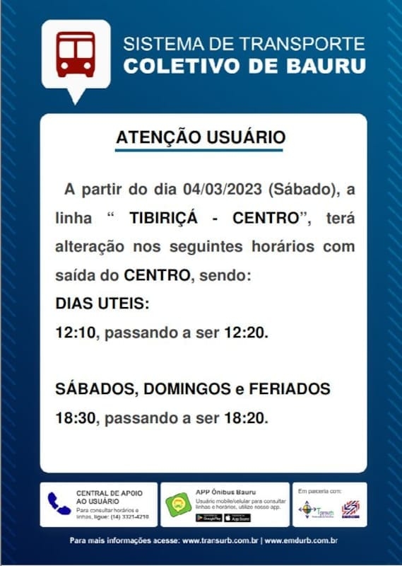 A Diretoria de Trânsito e Transporte da Emdurb informa que a linha “Tibiriçá-Centro” terá alteração em sua tabela horária.A partir do próximo sábado, 04/03 o carro com saída do Centro as 12h10 passará a sair as 12h20 nos dias úteis e aos sábados, domingos e feriados saíra as 18h20 em vez de 18h30.