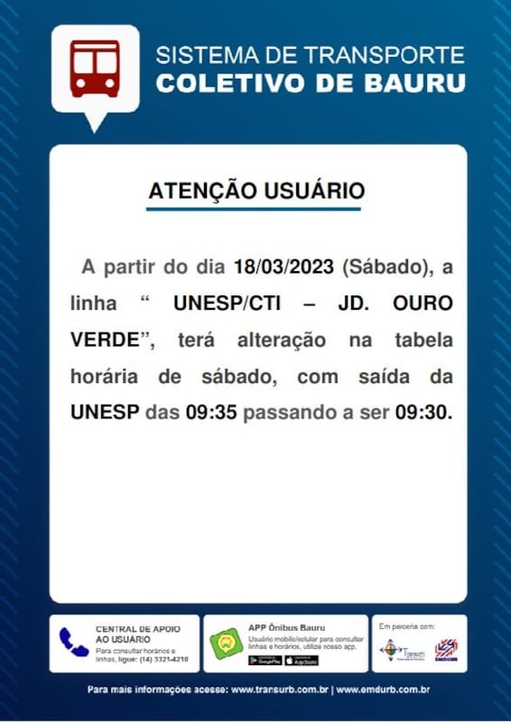 A EMDURB informa que a linha “Unesp/CTI – Jd. Ouro Verde”  terá alteração na tabela horária de sábado.A partir deste sábado, 18, o horário de saída da Unesp será as 9h30 e não mais as 9h35.