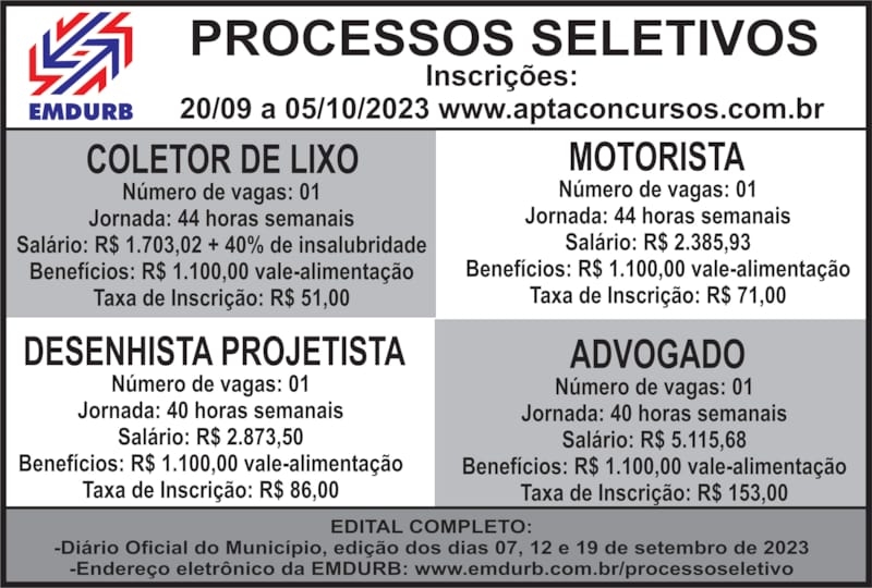 A EMDURB publicará no Diário Oficial do Município de Bauru, nas edições dos dias 07, 12 e 19/09/2023, edital para realização de processo seletivo para contratação de Coletor de Lixo, Motorista, Desenhista Projetista e Advogado.As inscrições serão realizadas exclusivamente pela internet, no endereço eletrônico www.aptaconcursos.com.br, no período de 20/09 a 05/10/2023, observado o horário oficial de Brasília/DF. O edital completo também poderá ser acessado pelo endereço eletrônico da EMDURB www.emdurb.com.br/processoseletivoCOLETOR DE LIXO:O processo seletivo para contratação de Coletor de Lixo visa o preenchimento de 01 (uma) vaga, com jornada de 44 horas semanais. A escolaridade exigida é Ensino Fundamental Completo.O salário é de R$ 1.703,02 (um mil, setecentos e três reais e dois centavos), mais adicional de insalubridade de 40%, mais vale-alimentação no valor de R$ 1.100,00 (mil e cem reais). A taxa de inscrição é de R$ 51,00 (cinquenta e um reais) e deve ser paga por meio de boleto bancário gerado no sistema.DESCRIÇÃO SUMÁRIA DO CARGO: Executar tarefas de percorrer e coletar resíduos residenciais, hospitalares, etc, em vias e logradouros públicos, despejando-os em veículos apropriados, contribuindo para a manutenção,  limpeza e a higiene do município.MOTORISTA:O processo seletivo para contratação de Motorista visa o preenchimento de 01 (uma) vaga, com jornada de 44 horas semanais. A escolaridade exigida e respectivos requisitos são: Ensino Médio Completo e Carteira de Habilitação categoria D, com autorização para exercer atividade remunerada, conforme art. 147, §5º do CTB – Código de Trânsito Brasileiro.O salário é de R$ R$ 2.385,93 (dois mil, trezentos e oitenta e cinco reais e noventa e três centavos), mais vale-alimentação no valor de R$ 1.100,00 (mil e cem reais). A taxa de inscrição é de R$ 71,00 (setenta e um reais) e deve ser paga através de boleto bancário gerado no sistema.DESCRIÇÃO SUMÁRIA DO CARGO: Dirigir veículos da empresa, conduzindo pessoas, cargas, etc, a fim de atender os diversos setores, bem como comunicar defeitos apresentados para execução de reparos nos veículos.DESENHISTA PROJETISTA:O processo seletivo para contratação de Desenhista Projetista visa o preenchimento de 01 (uma) vaga, com jornada de 40 horas semanais. A escolaridade exigida e respectivos requisitos são: Ensino Médio Completo e Curso Específico de Desenho Técnico.O salário é de R$  R$ 2.873,50 (dois mil, oitocentos e setenta e três reais e cinquenta centavos), mais vale-alimentação no valor de R$ 1.100,00 (mil e cem reais). A taxa de inscrição é de R$ 86,00 (oitenta e seis reais) e deve ser paga através de boleto bancário gerado no sistema.DESCRIÇÃO SUMÁRIA DO CARGO: Elaborar projetos referentes a todas as áreas da engenharia, baseando-se em conhecimento técnico e normas técnicas, utilizando-se principalmente de programas computacionais do tipo CAD.ADVOGADO:O processo seletivo para contratação de Advogado visa o preenchimento de 01 (uma) vaga, com jornada de 40 horas semanais. A escolaridade exigida e respectivos requisitos são: Curso Superior em Direito, com registro na OAB – Ordem dos Advogados do Brasil.O salário é de R$  R$ R$ 5.115,68 (cinco mil, cento e quinze reais e sessenta e oito centavos), mais vale-alimentação no valor de R$ 1.100,00 (mil e cem reais). A taxa de inscrição é de R$ 153,00 (cento e cinquenta e três reais) e deve ser paga através de boleto bancário gerado no sistema.DESCRIÇÃO SUMÁRIA DO CARGO: Postular, em nome da Empresa, em juízo, propondo ou contestando ações, solicitando providências junto ao magistrado e/ou Ministério Público, Tribunal de Contas, avaliando provas documentais e orais, realizando audiências trabalhistas e cíveis, no interesse da EMDURB. Orientar outros setores da empresa em assuntos correlacionados à área jurídica e pertinentes ao interesse da Empresa. Emitir pareceres em processos administrativos e licitações nos moldes exigidos na legislação vigente.