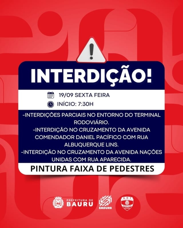 A Diretoria de Sistema Viário e Transportes da EMDURB, por meio do GOT, informa as seguintes interdições:-Interdições parciais no entorno do Terminal Rodoviário, a partir das 7h30, para pintura de faixas de pedestres;-Interdição no cruzamento da avenida Comendador Daniel Pacífico com rua Albuquerque Lins, a partir das 7h30, para pintura de faixas de pedestres;-Interdição no cruzamento da avenida Nações Unidas com rua Aparecida, a partir das 7h30, para pintura de faixas de pedestres;-Interdição no cruzamento da avenida Comendador Daniel Pacífico com rua Vital Brasil, a partir das 13h30, para pintura de faixas de pedestres;-Interdição nos quarteirões 01 ao 04 da rua Luiz Carlos Machado Ballaminut, a partir das 13h30, para pintura de faixas de pedestres.Os locais estarão sinalizados pelo GOT – Grupo de Operações de Trânsito. A EMDURB pede atenção aos motoristas.Acesse o link e participe da comunidade GOT e receba as interdições.https://chat.whatsapp.com/H9DZAyZCfXf3ata4FZ2gyqComunicação – EMDURB