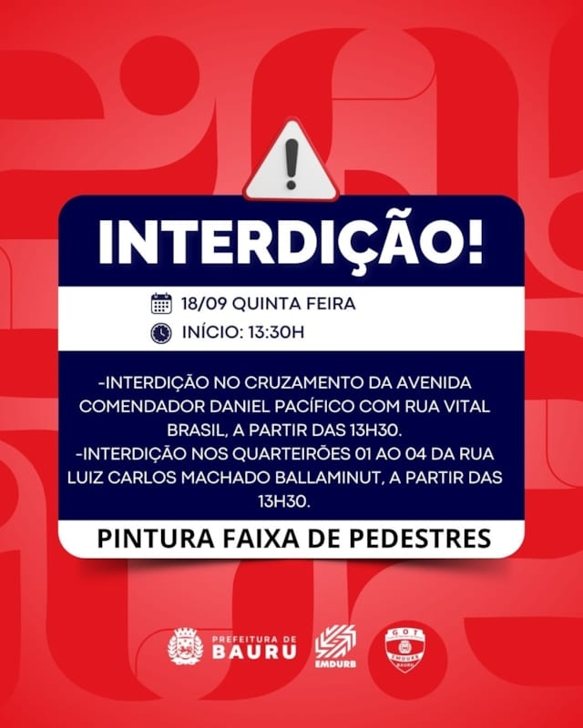 -Interdição no cruzamento da avenida Comendador Daniel Pacífico com rua Vital Brasil, a partir das 13h30, para pintura de faixas de pedestres;