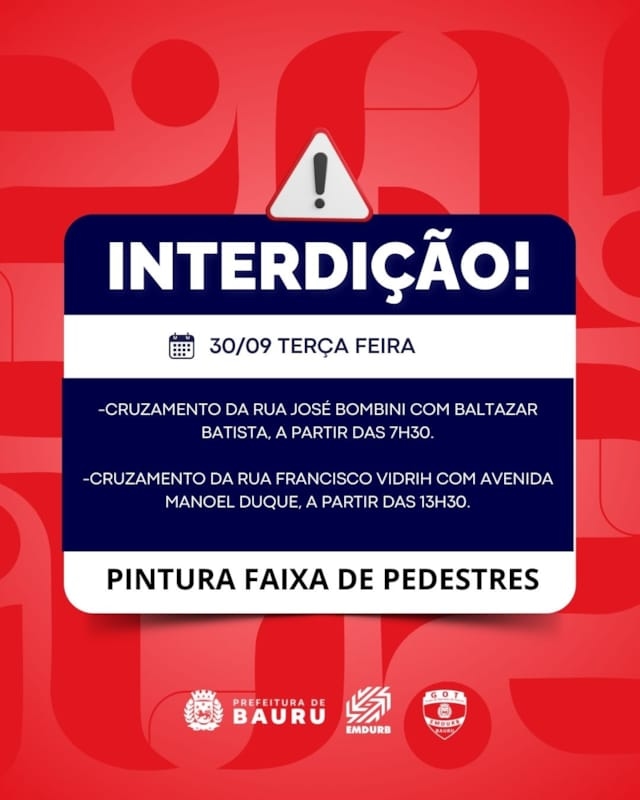 A Diretoria de Sistema Viário e Transportes da EMDURB, por meio do GOT, informa as seguintes interdições:-Cruzamento da rua José Bombini com Baltazar Batista, a partir das 7h30, para pintura de faixas de pedestres;-Cruzamento da rua Francisco Vidrih com Avenida Manoel Duque, a partir das 13h30, para pintura de faixas de pedestres.Os locais estarão sinalizados pelo GOT – Grupo de Operações de Trânsito. A EMDURB pede atenção aos motoristas.Acesse o link e participe da comunidade GOT e receba as interdições.https://chat.whatsapp.com/H9DZAyZCfXf3ata4FZ2gyqComunicação – EMDURB