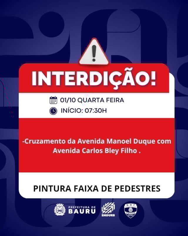 A Diretoria de Sistema Viário e Transportes da EMDURB, por meio do GOT, informa as seguintes interdições:-Quarteirão 03 da rua Wirton P. dos Santos, das 8h às 12h, para evento religioso;-Cruzamento da Avenida Manoel Duque com Avenida Carlos Bley Filho, a partir das 7h30, para pintura de faixas de pedestres. Os locais estarão sinalizados pelo GOT – Grupo de Operações de Trânsito. A EMDURB pede atenção aos motoristas.Acesse o link e participe da comunidade GOT e receba as interdições.https://chat.whatsapp.com/H9DZAyZCfXf3ata4FZ2gyqComunicação – EMDURB