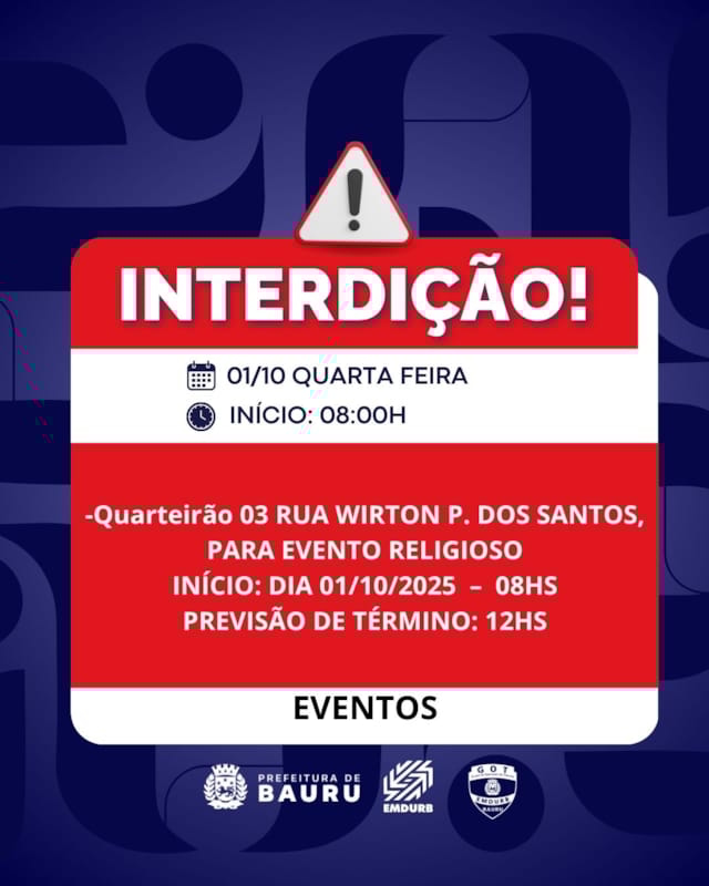 -Quarteirão 03 da rua Wirton P. dos Santos, das 8h às 12h, para evento religioso;