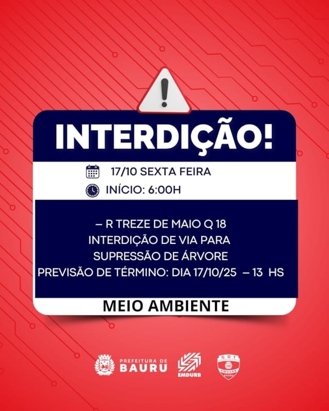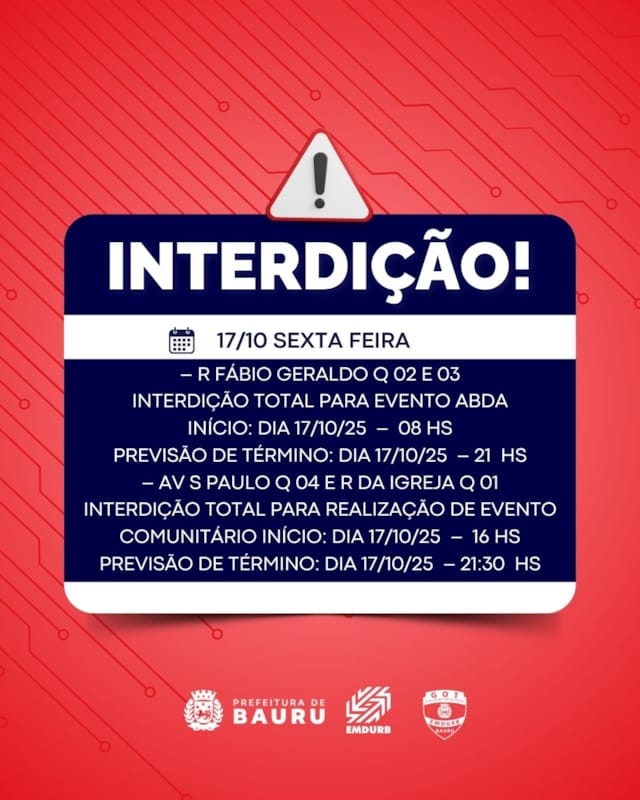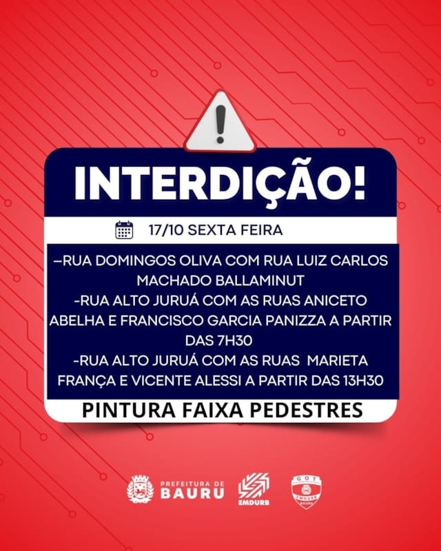 Bauru, 16 de outubro de 2025EMDURB informa interdições programadas para sexta-feira (17) A Diretoria de Sistema Viário e Transportes da EMDURB, por meio do GOT, informa as seguintes interdições:-Rua Domingos Oliva com a Rua Luiz Carlos Machado Ballaminut-Rua Alto Juruá com as Ruas Aniceto Abelha e Francisco Garcia Panizza a partir das 7h30, para pintura de faixas de pedestres; -Rua Alto Juruá com as Ruas Marieta França e Vicente Alessi a partir das 13h30, para pintura de faixas de pedestres.R Treze de Maio Q 18Interdição de via para supressão de árvoreINÍCIO:17/10/25– 06HS; PREVISÃO DE TÉRMINO: DIA 17/10/25 – 13 HS– R Fábio Geraldo Q 02 e 03Interdição Total para Evento ABDAINÍCIO: DIA 17/10/25 – 08 HSPREVISÃO DE TÉRMINO: DIA 17/10/25 – 21 HS– Av S Paulo Q 04 e R da Igreja Q 01Interdição total para realização de evento comunitárioINÍCIO: DIA 17/10/25 – 16 HSPREVISÃO DE TÉRMINO: DIA 17/10/25 – 21:30 HSOs locais estarão sinalizados pelo GOT – Grupo de Operações de Trânsito. A EMDURB pede atenção aos motoristas.Acesse o link e participe da comunidade GOT e receba as interdições.https://chat.whatsapp.com/H9DZAyZCfXf3ata4FZ2gyqComunicação – EMDURB-