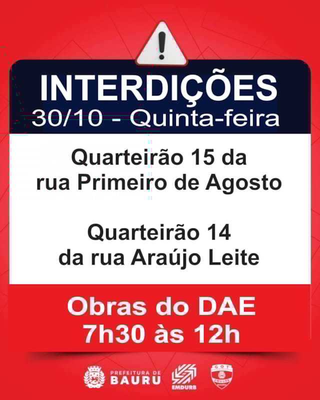 A Diretoria de Sistema Viário e Transportes da EMDURB, por meio do GOT, informa as seguintes interdições:-Quarteirão 15 da rua Primeiro de Agosto, das 7h30 às 12h, para obras do DAE;-Quarteirão 14 da rua Araújo Leite, das 7h30 às 12h, para obras do DAE. Os locais estarão sinalizados pelo GOT – Grupo de Operações de Trânsito. A EMDURB pede atenção aos motoristas.Acesse o link e participe da comunidade GOT e receba as interdições.https://chat.whatsapp.com/H9DZAyZCfXf3ata4FZ2gyqComunicação – EMDURB