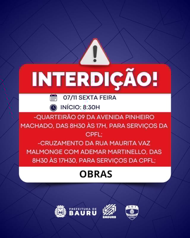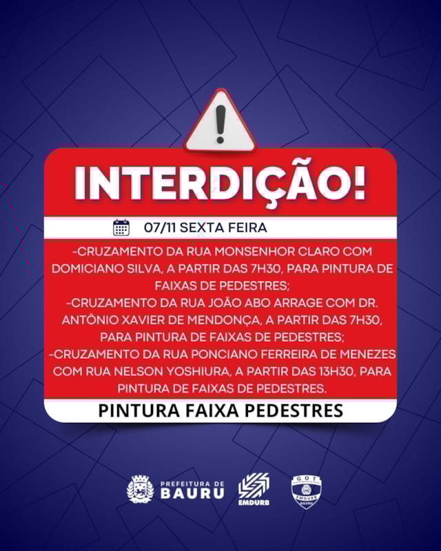 A Diretoria de Sistema Viário e Transportes da EMDURB, por meio do GOT, informa as seguintes interdições:-Quarteirão 09 da avenida Pinheiro Machado, das 8h30 às 17h, para serviços da CPFL;-Cruzamento da rua Maurita Vaz Malmonge com Ademar Martinello, das 8h30 às 17h30, para serviços da CPFL;-Cruzamento da rua Monsenhor Claro com Domiciano Silva, a partir das 7h30, para pintura de faixas de pedestres;-Cruzamento da rua João Abo Arrage com Dr. Antônio Xavier de Mendonça, a partir das 7h30, para pintura de faixas de pedestres;-Cruzamento da rua Ponciano Ferreira de Menezes com Rua Nelson Yoshiura, a partir das 13h30, para pintura de faixas de pedestres. Os locais estarão sinalizados pelo GOT – Grupo de Operações de Trânsito. A EMDURB pede atenção aos motoristas.Acesse o link e participe da comunidade GOT e receba as interdições.https://chat.whatsapp.com/H9DZAyZCfXf3ata4FZ2gyqComunicação – EMDURB