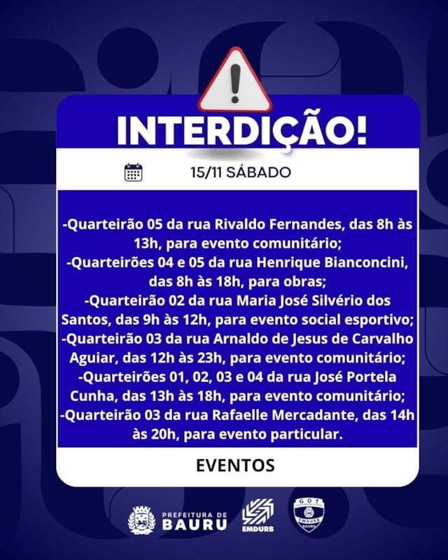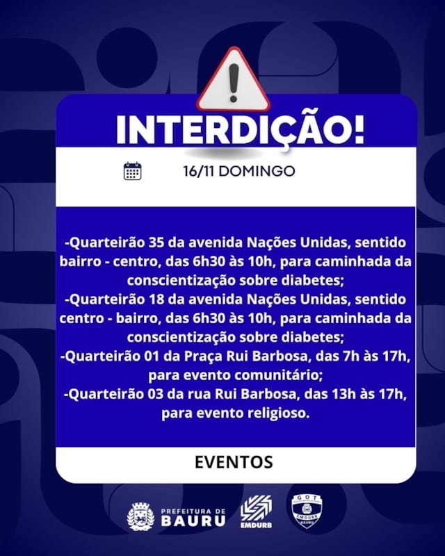 A Diretoria de Sistema Viário e Transportes da EMDURB, por meio do GOT, informa as seguintes interdições:SÁBADO (15):-Quarteirão 05 da rua Rivaldo Fernandes, das 8h às 13h, para evento comunitário;-Quarteirões 04 e 05 da rua Henrique Bianconcini, das 8h às 18h, para obras;-Quarteirão 02 da rua Maria José Silvério dos Santos, das 9h às 12h, para evento social esportivo;-Quarteirão 03 da rua Arnaldo de Jesus de Carvalho Aguiar, das 12h às 23h, para evento comunitário;-Quarteirões 01, 02, 03 e 04 da rua José Portela Cunha, das 13h às 18h, para evento comunitário;-Quarteirão 03 da rua Rafaelle Mercadante, das 14h às 20h, para evento particular.DOMINGO (16):-Quarteirão 35 da avenida Nações Unidas, sentido bairro - centro, das 6h30 às 10h, para caminhada da conscientização sobre diabetes;-Quarteirão 18 da avenida Nações Unidas, sentido centro - bairro, das 6h30 às 10h, para caminhada da conscientização sobre diabetes;-Quarteirão 01 da Praça Rui Barbosa, das 7h às 17h, para evento comunitário;-Quarteirão 03 da rua Rui Barbosa, das 13h às 17h, para evento religioso.Os locais estarão sinalizados pelo GOT – Grupo de Operações de Trânsito. A EMDURB pede atenção aos motoristas.Acesse o link e participe da comunidade GOT e receba nossas interdições.https://chat.whatsapp.com/H9DZAyZCfXf3ata4FZ2gyqComunicação – EMDURB