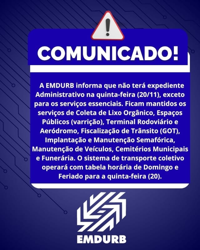 A EMDURB informa que não terá expediente Administrativo na quinta-feira (20/11), exceto para os serviços essenciais. Ficam mantidos os serviços de Coleta de Lixo Orgânico, Espaços Públicos (varrição), Terminal Rodoviário e Aeródromo, Fiscalização de Trânsito (GOT), Implantação e Manutenção Semafórica, Manutenção de Veículos, Cemitérios Municipais e Funerária. O sistema de transporte coletivo operará com tabela horária de Domingo e Feriado para a quinta-feira (20).