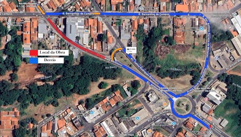 A Diretoria de Sistema Viário e Transportes da EMDURB, por meio do GOT, informa que o quarteirão 01 da avenida Ambleto Bertolucci estará interditado para obras do DAE, nos dias 25, 26 e 27/11. O desvio será pela rua Bernardino de Campos, rua Vereador Antônio Ferreira de Menezes, rotatória da avenida Castelo Branco, avenida Italina Rodrigues Bertolucci, retornando para a avenida Ambleto Bertolucci, seguindo sentido avenida Duque de Caxias.