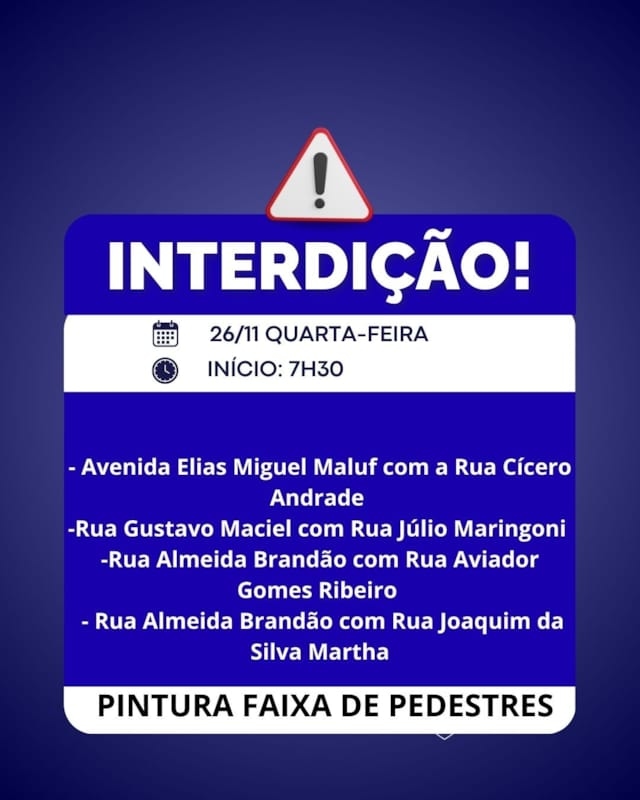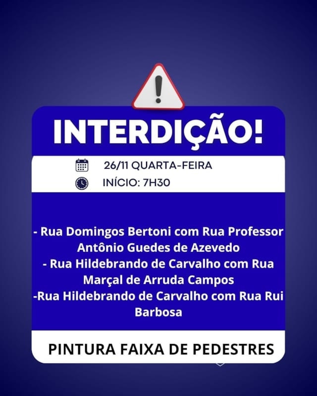 Bauru, 25 de novembro de 2025EMDURB informa interdições programadas para quarta-feira (26) A Diretoria de Sistema Viário e Transportes da EMDURB, por meio do GOT, informa as seguintes interdições:-Rua Domingos Bertoni com Rua Professor Antônio Guedes de Azevedo-Rua Hildebrando de Carvalho com Rua Marçal de Arruda Campos-Rua Hildebrando de Carvalho com Rua Rui Barbosa-Avenida Elias Miguel Maluf com a Rua Cícero Andrade -Rua Gustavo Maciel com Rua Júlio Maringoni-Rua Almeida Brandão com Rua Aviador Gomes Ribeiro -Rua Almeida Brandão com Rua Joaquim da Silva Martha, a partir das 7h30 para pintura de faixas de pedestres; Os locais estarão sinalizados pelo GOT – Grupo de Operações de Trânsito. A EMDURB pede atenção aos motoristas.Acesse o link e participe da comunidade GOT e receba as interdições.https://chat.whatsapp.com/H9DZAyZCfXf3ata4FZ2gyqComunicação – EMDURB