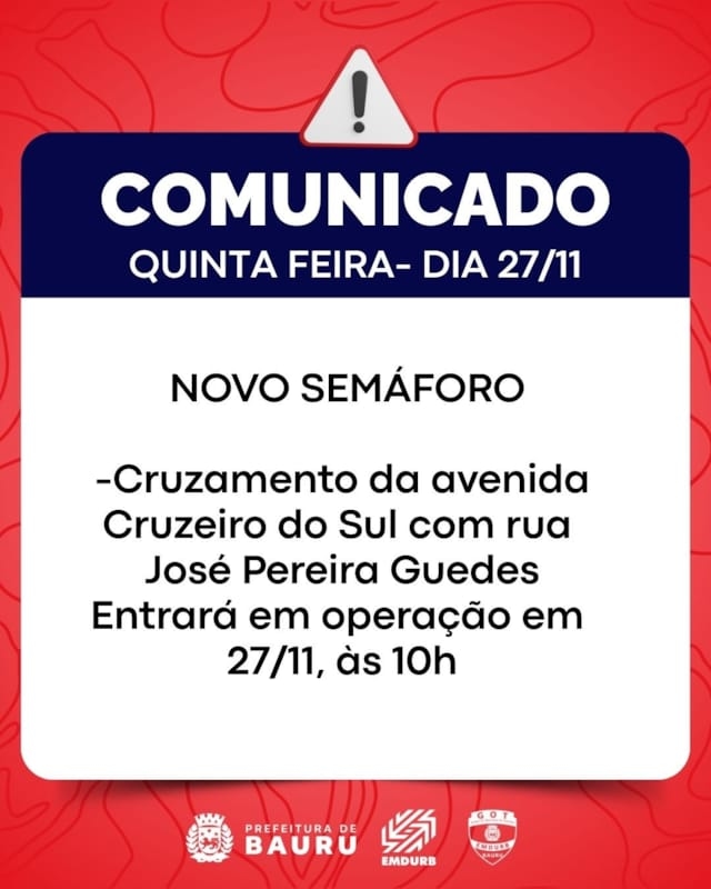 Devido a implantação do semáforo, a EMDURB implantará sentido único de circulação no quarteirão 06 da rua José Pereira Guedes, no sentido da avenida Cruzeiro do Sul para a rua Eduardo Martins, para melhorar fluidez do trânsito. A nova sinalização entrará em vigor na quinta-feira (27).
