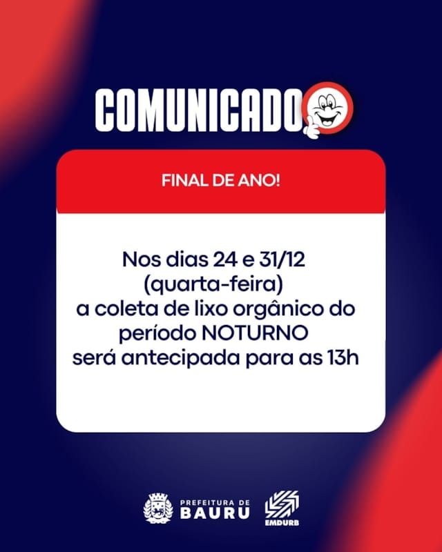 A EMDURB informa como será o funcionamento do expediente administrativo e serviços essenciais para o período de Natal e Ano Novo.Dia 24/12/2025 (quarta-feira):-Expediente Administrativo funcionará até as 12h.-Ficam mantidos os serviços: Terminal Rodoviário e Aeródromo, Fiscalização de Trânsito (GOT), Implantação e Manutenção Semafórica, Cemitérios Municipais e Funerária, Varrição, Estacionamento Rotativo, Manutenção de Veículos, Coleta Orgânica (a coleta do período NOTURNO será antecipada para as 13h, com exceção da região central que terá início às 17h).Dia 25/12/2025 (quinta-feira):-Expediente Administrativo: NÃO HAVERÁ.-Coleta de lixo orgânico, Manutenção de Veículos, Varrição, Estacionamento Rotativo: NÃO HAVERÁ.-Ficam mantidos os serviços: Terminal Rodoviário e Aeródromo, Fiscalização de Trânsito (GOT), Implantação e Manutenção Semafórica, Cemitérios Municipais e Funerária.Dia 26/12/2025 (sexta-feira):-Expediente Administrativo: NÃO HAVERÁ.-Ficam mantidos os serviços: Terminal Rodoviário e Aeródromo, Fiscalização de Trânsito (GOT), Implantação e Manutenção Semafórica, Cemitérios Municipais e Funerária, Varrição (acompanhará o horário do Comércio), Estacionamento Rotativo (acompanhará o horário do Comércio), Manutenção de Veículos, Coleta Orgânica.Dia 31/12/2025 (quarta-feira):-Expediente Administrativo funcionará até as 12h.-Ficam mantidos os serviços: Terminal Rodoviário e Aeródromo, Fiscalização de Trânsito (GOT), Implantação e Manutenção Semafórica, Cemitérios Municipais e Funerária, Varrição, Estacionamento Rotativo, Manutenção de Veículos, Coleta Orgânica (a coleta do período NOTURNO será antecipada para as 13h, com exceção da região central que terá início às 17h).Dia 01/01/2026 (quinta-feira):-Expediente Administrativo: NÃO HAVERÁ.-Coleta de lixo orgânico, Manutenção de Veículos, Varrição, Estacionamento Rotativo: NÃO HAVERÁ.-Ficam mantidos os serviços de Terminal Rodoviário e Aeródromo, Fiscalização de Trânsito (GOT), Implantação e Manutenção Semafórica, Cemitérios Municipais e Funerária.Dia 02/01/2026 (sexta-feira):-Haverá expediente administrativo normal, bem como todos os serviços essenciais.Comunicação – EMDURB