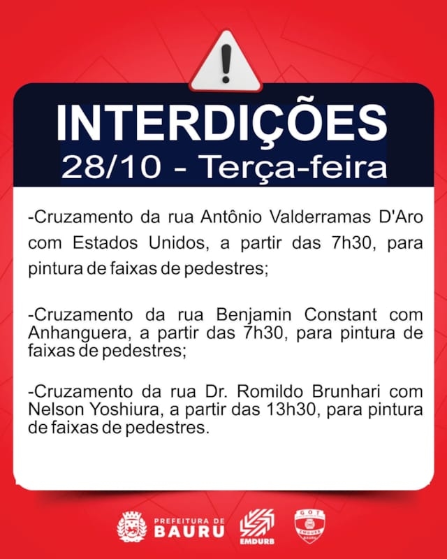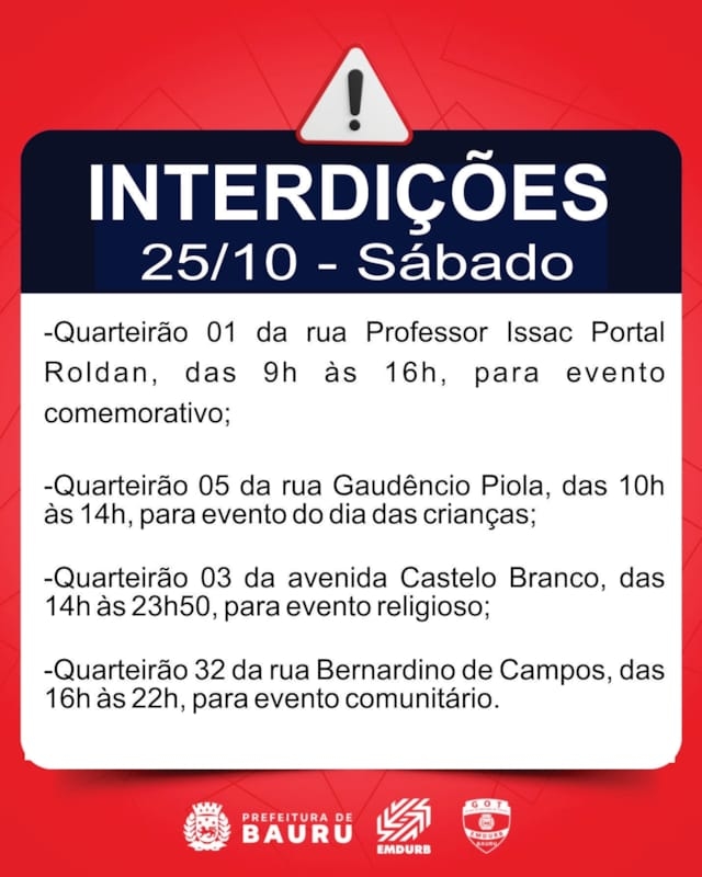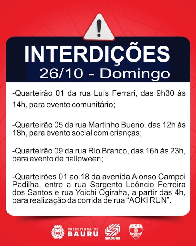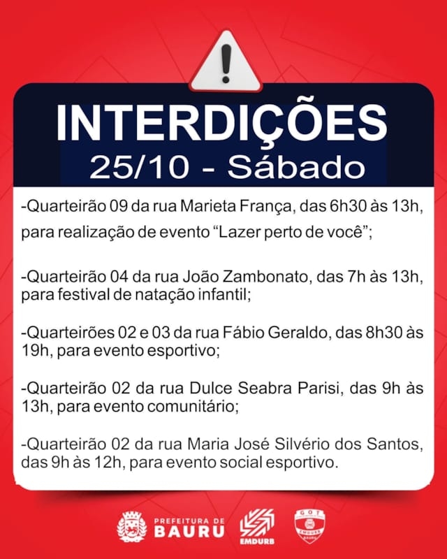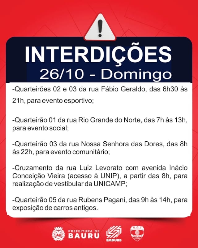 A Diretoria de Sistema Viário e Transportes da EMDURB, por meio do GOT, informa as seguintes interdições:SÁBADO (25):-Quarteirão 09 da rua Marieta França, das 6h30 às 13h, para realização de evento “Lazer perto de você”;-Quarteirão 04 da rua João Zambonato, das 7h às 13h, para festival de natação infantil;-Quarteirões 02 e 03 da rua Fábio Geraldo, das 8h30 às 19h, para evento esportivo;-Quarteirão 02 da rua Dulce Seabra Parisi, das 9h às 13h, para evento comunitário;-Quarteirão 02 da rua Maria José Silvério dos Santos, das 9h às 12h, para evento social esportivo;-Quarteirão 01 da rua Professor Issac Portal Roldan, das 9h às 16h, para evento comemorativo;-Quarteirão 05 da rua Gaudêncio Piola, das 10h às 14h, para evento do dia das crianças;-Quarteirão 03 da avenida Castelo Branco, das 14h às 23h50, para evento religioso;-Quarteirão 32 da rua Bernardino de Campos, das 16h às 22h, para evento comunitário.DOMINGO (26):-Quarteirões 02 e 03 da rua Fábio Geraldo, das 6h30 às 21h, para evento esportivo;-Quarteirão 01 da rua Rio Grande do Norte, das 7h às 13h, para evento social;-Quarteirão 03 da rua Nossa Senhora das Dores, das 8h às 22h, para evento comunitário;-Cruzamento da rua Luiz Levorato com avenida Inácio Conceição Vieira (acesso à UNIP), a partir das 8h, para realização de vestibular da UNICAMP;-Quarteirão 05 da rua Rubens Pagani, das 9h às 14h, para exposição de carros antigos;-Quarteirão 01 da rua Luís Ferrari, das 9h30 às 14h, para evento comunitário;-Quarteirão 05 da rua Martinho Bueno, das 12h às 18h, para evento social com crianças;-Quarteirão 09 da rua Rio Branco, das 16h às 23h, para evento de halloween;-Quarteirões 01 ao 18 da avenida Alonso Campoi Padilha, entre a rua Sargento Leôncio Ferreira dos Santos e rua Yoichi Ogiraha, a partir das 4h, para realização da corrida de rua “AOKI RUN”.TERÇA-FEIRA (28):-Cruzamento da rua Antônio Valderramas D'Aro com Estados Unidos, a partir das 7h30, para pintura de faixas de pedestres;-Cruzamento da rua Benjamin Constant com Anhanguera, a partir das 7h30, para pintura de faixas de pedestres;-Cruzamento da rua Dr. Romildo Brunhari com Nelson Yoshiura, a partir das 13h30, para pintura de faixas de pedestres.Os locais estarão sinalizados pelo GOT – Grupo de Operações de Trânsito. A EMDURB pede atenção aos motoristas.Acesse o link e participe da comunidade GOT e receba nossas interdições.https://chat.whatsapp.com/H9DZAyZCfXf3ata4FZ2gyqComunicação – EMDURB